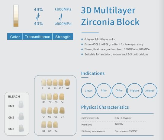 Yucera 3D Plus meerlagig zirconiablok vertegenwoordigt de hoogste klasse van zirconiamateriaal, met een natuurlijke kleurgradatie (van donker tot licht), variabele sterkte (1050MPa-700MPa),en gecontroleerde doorschijnendheid (43%-57%) van de baarmoederhals tot de snijdselen binnen één blok.